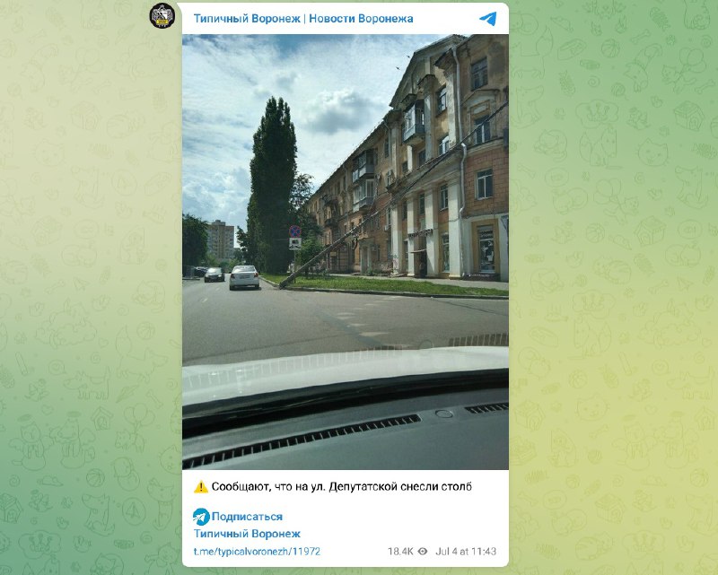 Опора освещения упала на дом №1 на улице Депутатской в Воронеже. Фото рухнувшего столба опубликовали в Telegram-канале «Типичный Воронеж» во вторник, 4 июля.